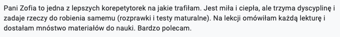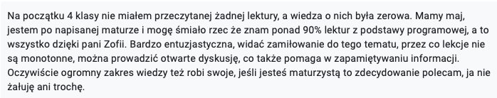 W trakcie zajęć skupiam się na gruntownym powtórzeniu materiału wymaganego przez CKE, nauce i doskonaleniu pisania rozprawek oraz ćwiczeniu zadań maturalnych. Oprócz tego jednak, staram się kształtować w moich uczniach także swobodę w wyrażaniu swojego zdania, ale również odwagę do tego, by się nie zgadzać i myśleć krytycznie, samodzielnie. Umiejętności te uważam za esencję tego, czego powinien nauczyć przedmiot, jakim jest język polski.
